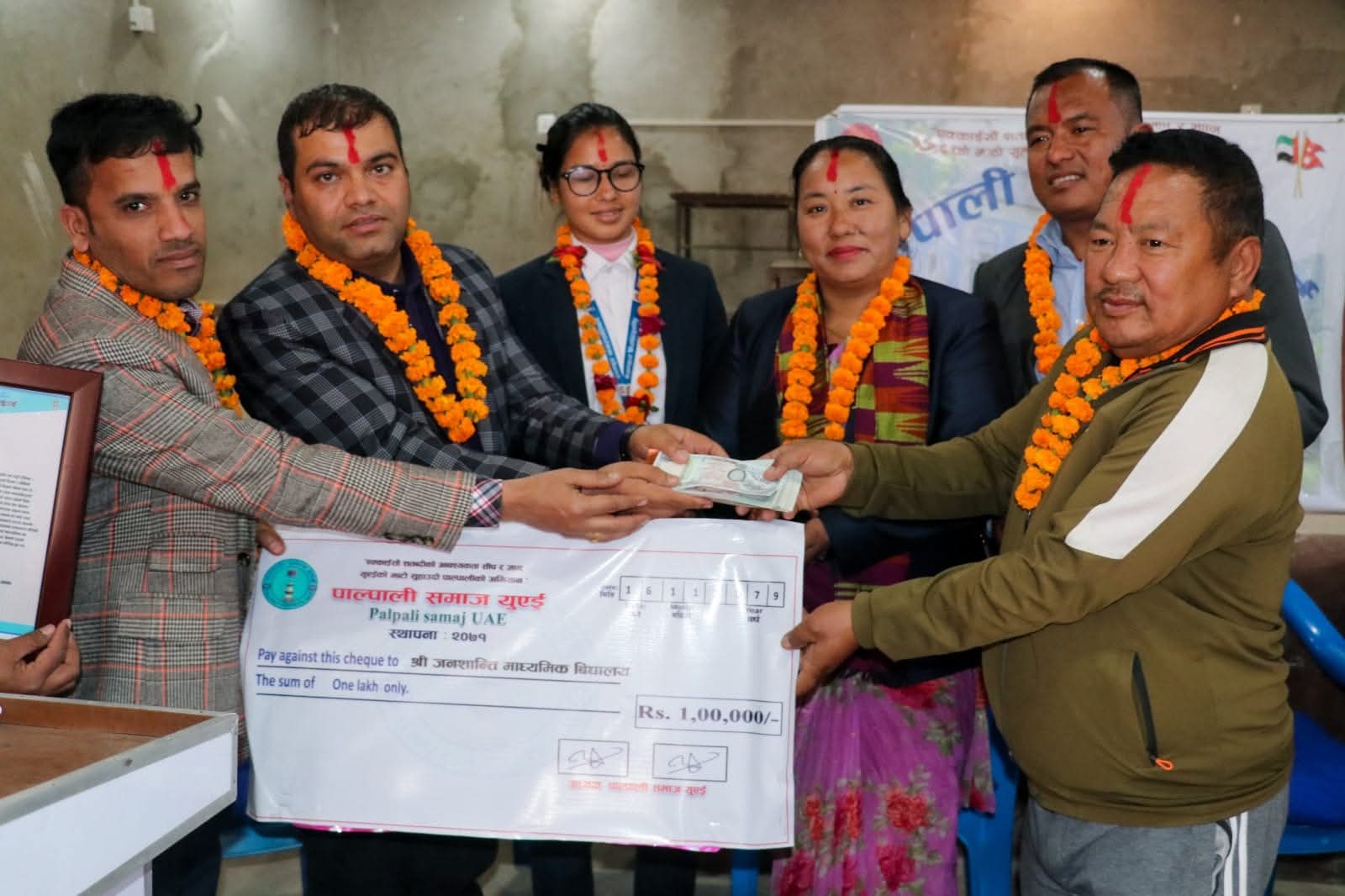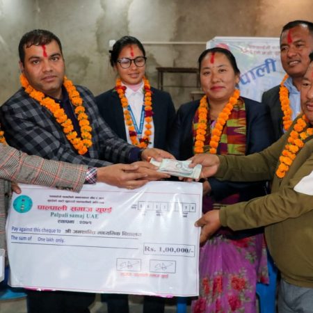 मिति २८ फेब्रुअरी २०२३ मा पाल्पाली समाज युएईले २०१५ – २०१७ को कार्यकालमा रामपुर नगरपालिकाको सिमाना रहेको ठाँउमा पचासौं बर्ष सम्म रहि रहने एउटा अनुपम चिनो स्वागत द्वार गेट बनाउने निर्णय गरेका थियौ तर त्यहाँ अझै पनि बाटोको फरकाउने निश्चिता नभएको र कोभिड 19 को कारण ले समाजको गतिविधिमा न्युनता आएकोले गेट बनाउन धेरै धनराशि खर्च हुने हुनाले त्यो निर्णयलाई परिमार्जन गर्दै तत्काल त्यहाँ शुरुआत गर्न छुट्याइएको रकमलाई रकमान्तर गर्दै त्यस ठाँउ बाट नजिकै रहेको रामपुर नगरपालिका वार्ड नम्बर ९ मा अबस्थित श्री जनशान्ती माध्यमिक विद्यालय मा अध्यनरत गरिव तथा जेहेन्दार विद्यार्थी भाइ बहिनीहरुको लागी रु . १०००००(एक लाख रुपैयाँ ) अक्षयकोषको रूपमा हस्तान्तरण कार्यमा पाल्पाली समाज युएईका महासचिव खुम प्रसाद न्यौपाने, सहकोषाध्यक्ष राजु बस्याल,र पुर्व केन्द्रिय सदस्य कृष्ण श्रेष्ठ श्री कृष्ण भट्टराई को उपस्थितिमा हस्तान्तरण सम्पन्न भएको थियो